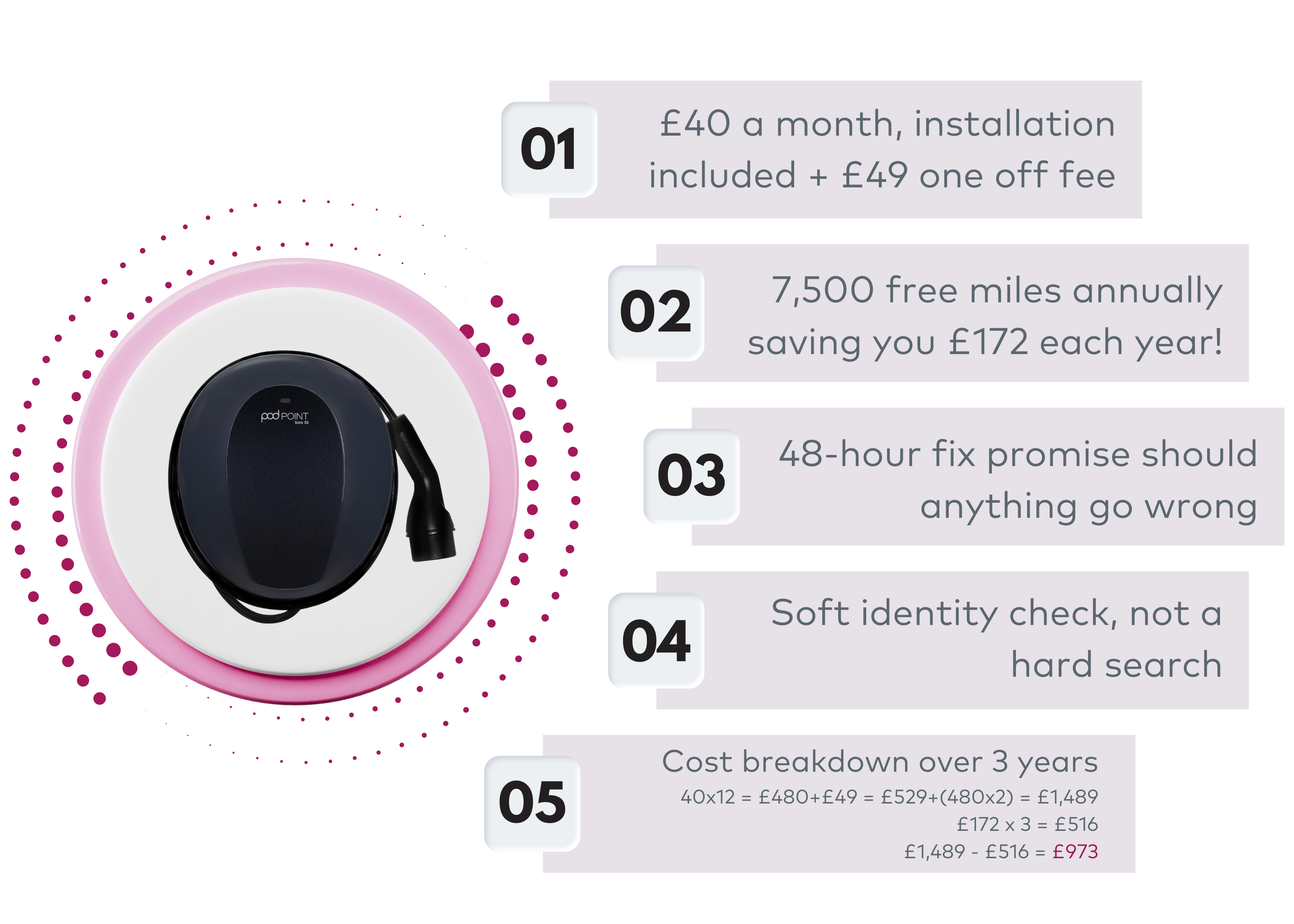 Through our partnership with Pod Point, we’re able to offer you Pod Drive at a significantly reduced cost. Currently available with the tethered charger, Pod Drive gives you full access to smart charging features. While the standard RRP for 3 years is £1,539, our exclusive price is just £973. Saving you an impressive £566 over the 3-year period.